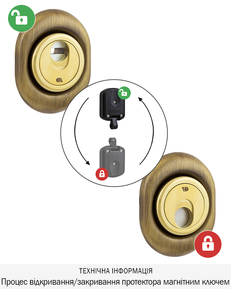 Захисний протектор моделі 3G2FM,з магнітним ключем призначений для захисту циліндрового механізму стандарту DIN, від зламу. Захисна шторка броненакладки, додатково захищає ключний отвір від потрапляння сторонніх предметів, вандалізму, підбору відмичок.