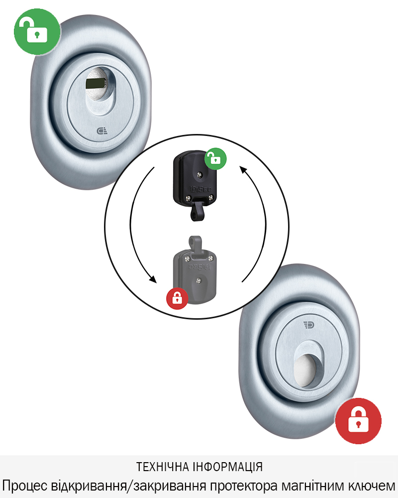 Захисний протектор моделі 3G2FM,з магнітним ключем призначений для захисту циліндрового механізму стандарту DIN, від зламу. Захисна шторка броненакладки, додатково захищає ключний отвір від потрапляння сторонніх предметів, вандалізму, підбору відмичок.
