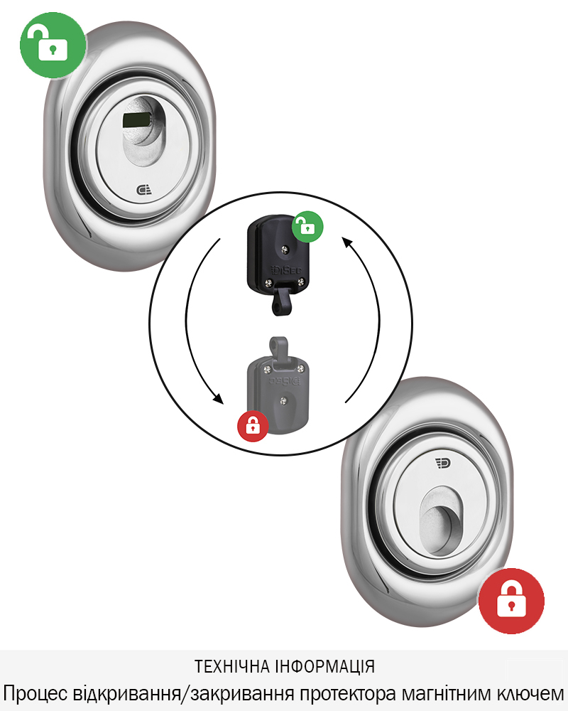 Захисний протектор моделі 3G2FM,з магнітним ключем призначений для захисту циліндрового механізму, стандарту DIN, від зламу. Захисна шторка броненакладки, додатково захищає ключний отвір від потрапляння сторонніх предметів, вандалізму, підбору відмичок.