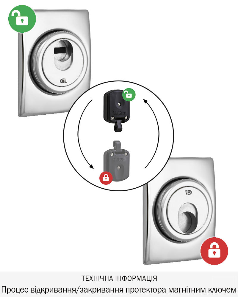 Захисний протектор моделі 3G2WB,з магнітним ключем призначений для захисту циліндрового механізму, стандарту DIN, від зламу. Захисна шторка броненакладки, додатково захищає ключний отвір від потрапляння сторонніх предметів, вандалізму, підбору відмичок.
