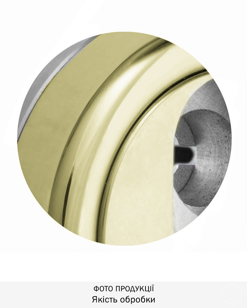 Обробка латунь PVD, має яскраво жовтий колір та поліровану поверхню. Обробка стійка до подряпин та впливу зовнішнього середовища. Найкраще виглядає на темних дверях, підходить до інтер’єрів у класичному стилі.