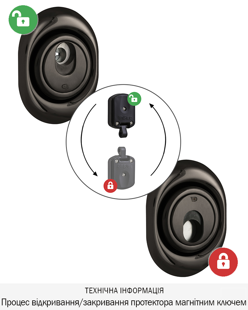 Захисний протектор моделі 3G8FMз магнітним ключем призначений для захисту циліндрового механізму OMEGA від зламу. Захисна шторка броненакладки, додатково захищає ключний отвір від потрапляння сторонніх предметів, вандалізму, підбору відмичок.