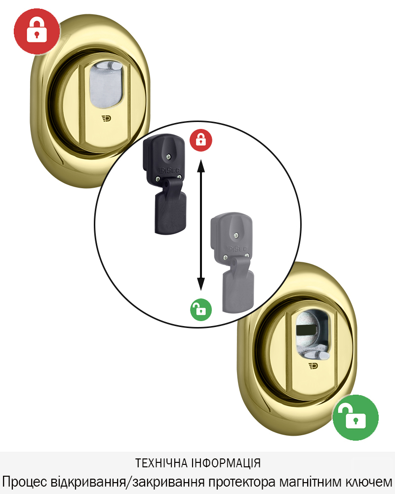 Захисний магнітний щиток специфікації 4GN2MB, захищає ключний отвір від потрапляння сторонніх предметів, вандалізму, підбору відмичок.Протектор захищає циліндровий механізм, стандарту DIN, від зламу.