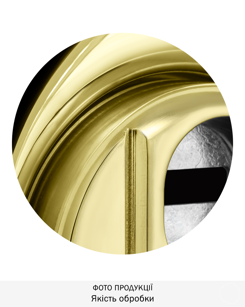 Обробка латунь PVD, має яскраво жовтий колір та поліровану поверхню. Обробка стійка до подряпин та впливу зовнішнього середовища. Найкраще виглядає на темних дверях, підходить до інтер’єрів у класичному стилі.