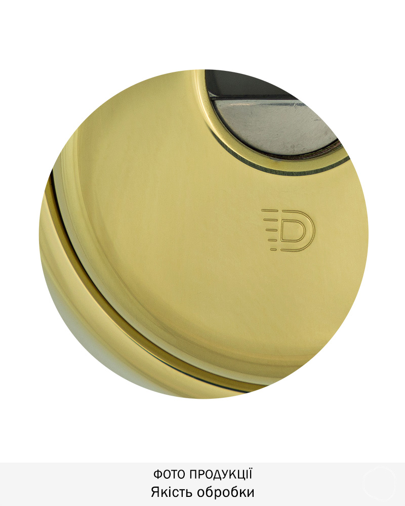 Обробка латунь PVD, має яскраво жовтий колір та поліровану поверхню. Обробка стійка до подряпин та впливу зовнішнього середовища. Найкраще виглядає на темних дверях, підходить до інтер’єрів у класичному стилі.