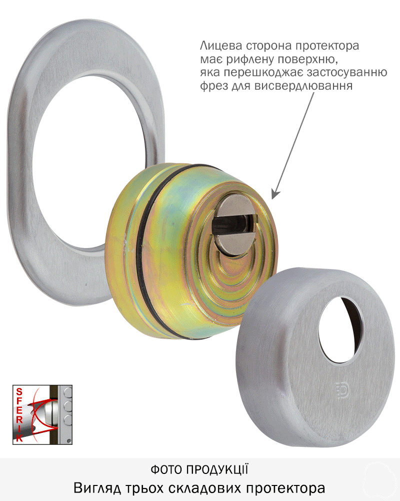 -Лицьова сторона протектора має рифлену поверхню, яка перешкоджає застосуванню фрез для висвердлювання.