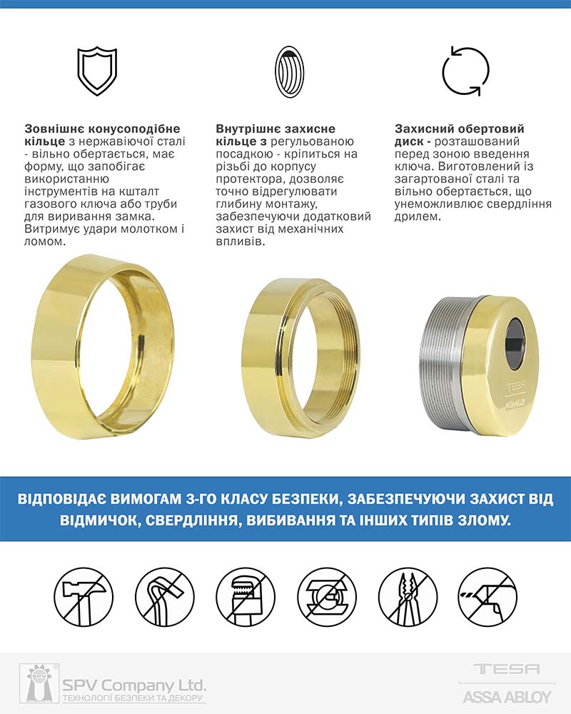 Відповідає вимогам 3-го класу безпеки, забезпечуючи захист від відмичок, свердління, вибивання та інших типів злому.