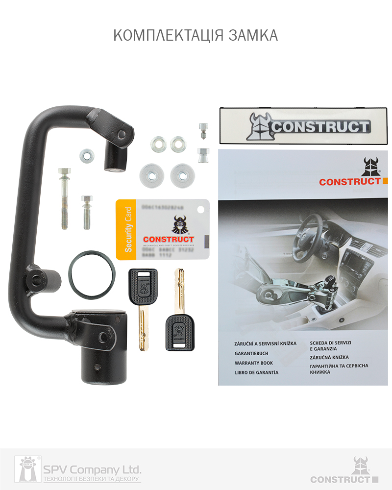 CONSTRUCT GEAR - механічний протиугінний замок коробки перемикання швидкостей (КПШ). Має унікальну конструкцію для конкретної моделі автомобіля та КПШ. Встановлюється за допомогою зривних болтів на штатні кріплення в кузові автомобіля. Принцип роботи механічного протиугінного замку CONSTRUCT GEAR полягає в блокуванні рухомих вузлів механізму перемикання швидкостей. Механічні КПШ блокуються в положенні “R”- задній хід, а автоматичні – в положенні “P”- паркінг. Для замикання потрібно перевести важіль КПШ в потрібне положення , вставити ключ в замок до упору та повернути ключ на 180 ° в крайнє положення. Відкрити його так само просто. В комплекті замка 2 ключа та пластикова картка для можливості виготовлення дубліката ключа. Не залежить від стану акумулятора та інших функцій автомобіля. Відкриття замка CONSTRUCT GEAR можливе виключно контактним способом за допомогою ключа, деактивація на відстані - неможлива. Замки CONSTRUCT GEAR поділяються на 4 цінові категорії – G1,G2,G3,G4 в залежності від конструктиву замка.