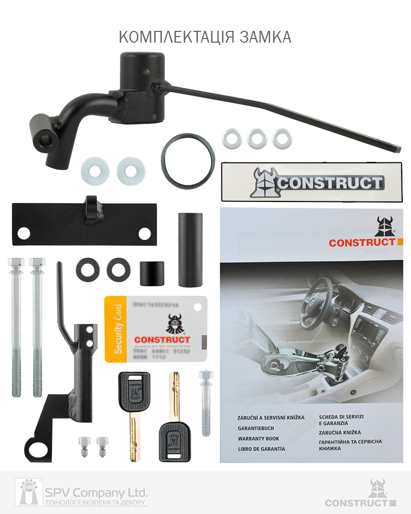 CONSTRUCT GEAR - механічний протиугінний замок коробки перемикання швидкостей (КПШ). Має унікальну конструкцію для конкретної моделі автомобіля та КПШ. Встановлюється за допомогою зривних болтів на штатні кріплення в кузові автомобіля. Принцип роботи механічного протиугінного замку CONSTRUCT GEAR полягає в блокуванні рухомих вузлів механізму перемикання швидкостей. Механічні КПШ блокуються в положенні “R”- задній хід, а автоматичні – в положенні “P”- паркінг. Для замикання потрібно перевести важіль КПШ в потрібне положення , вставити ключ в замок до упору та повернути ключ на 180 ° в крайнє положення. Відкрити його так само просто. В комплекті замка 2 ключа та пластикова картка для можливості виготовлення дубліката ключа. Не залежить від стану акумулятора та інших функцій автомобіля. Відкриття замка CONSTRUCT GEAR можливе виключно контактним способом за допомогою ключа, деактивація на відстані - неможлива. Замки CONSTRUCT GEAR поділяються на 4 цінові категорії – G1,G2,G3,G4 в залежності від конструктиву замка.