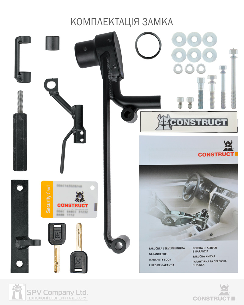CONSTRUCT GEAR - механічний протиугінний замок коробки перемикання швидкостей (КПШ). Має унікальну конструкцію для конкретної моделі автомобіля та КПШ. Встановлюється за допомогою зривних болтів на штатні кріплення в кузові автомобіля. Принцип роботи механічного протиугінного замку CONSTRUCT GEAR полягає в блокуванні рухомих вузлів механізму перемикання швидкостей. Механічні КПШ блокуються в положенні “R”- задній хід, а автоматичні – в положенні “P”- паркінг. Для замикання потрібно перевести важіль КПШ в потрібне положення , вставити ключ в замок до упору та повернути ключ на 180 ° в крайнє положення. Відкрити його так само просто. В комплекті замка 2 ключа та пластикова картка для можливості виготовлення дубліката ключа. Не залежить від стану акумулятора та інших функцій автомобіля. Відкриття замка CONSTRUCT GEAR можливе виключно контактним способом за допомогою ключа, деактивація на відстані - неможлива. Замки CONSTRUCT GEAR поділяються на 4 цінові категорії – G1,G2,G3,G4 в залежності від конструктиву замка.