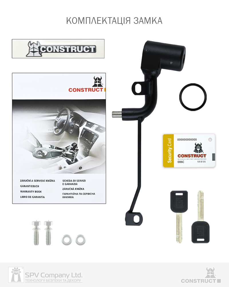 CONSTRUCT GEAR - механічний протиугінний замок коробки перемикання швидкостей (КПШ). Має унікальну конструкцію для конкретної моделі автомобіля та КПШ. Встановлюється за допомогою зривних болтів на штатні кріплення в кузові автомобіля. Принцип роботи механічного протиугінного замку CONSTRUCT GEAR полягає в блокуванні рухомих вузлів механізму перемикання швидкостей. Механічні КПШ блокуються в положенні “R”- задній хід, а автоматичні – в положенні “P”- паркінг. Для замикання потрібно перевести важіль КПШ в потрібне положення , вставити ключ в замок до упору та повернути ключ на 180 ° в крайнє положення. Відкрити його так само просто. В комплекті замка 2 ключа та пластикова картка для можливості виготовлення дубліката ключа. Не залежить від стану акумулятора та інших функцій автомобіля. Відкриття замка CONSTRUCT GEAR можливе виключно контактним способом за допомогою ключа, деактивація на відстані - неможлива. Замки CONSTRUCT GEAR поділяються на 4 цінові категорії – G1,G2,G3,G4 в залежності від конструктиву замка.