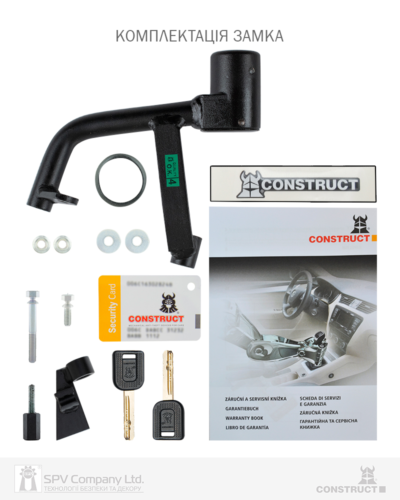 CONSTRUCT GEAR - механічний протиугінний замок коробки перемикання швидкостей (КПШ). Має унікальну конструкцію для конкретної моделі автомобіля та КПШ. Встановлюється за допомогою зривних болтів на штатні кріплення в кузові автомобіля. Принцип роботи механічного протиугінного замку CONSTRUCT GEAR полягає в блокуванні рухомих вузлів механізму перемикання швидкостей. Механічні КПШ блокуються в положенні “R”- задній хід, а автоматичні – в положенні “P”- паркінг. Для замикання потрібно перевести важіль КПШ в потрібне положення , вставити ключ в замок до упору та повернути ключ на 180 ° в крайнє положення. Відкрити його так само просто. В комплекті замка 2 ключа та пластикова картка для можливості виготовлення дубліката ключа. Не залежить від стану акумулятора та інших функцій автомобіля. Відкриття замка CONSTRUCT GEAR можливе виключно контактним способом за допомогою ключа, деактивація на відстані - неможлива. Замки CONSTRUCT GEAR поділяються на 4 цінові категорії – G1,G2,G3,G4 в залежності від конструктиву замка.
