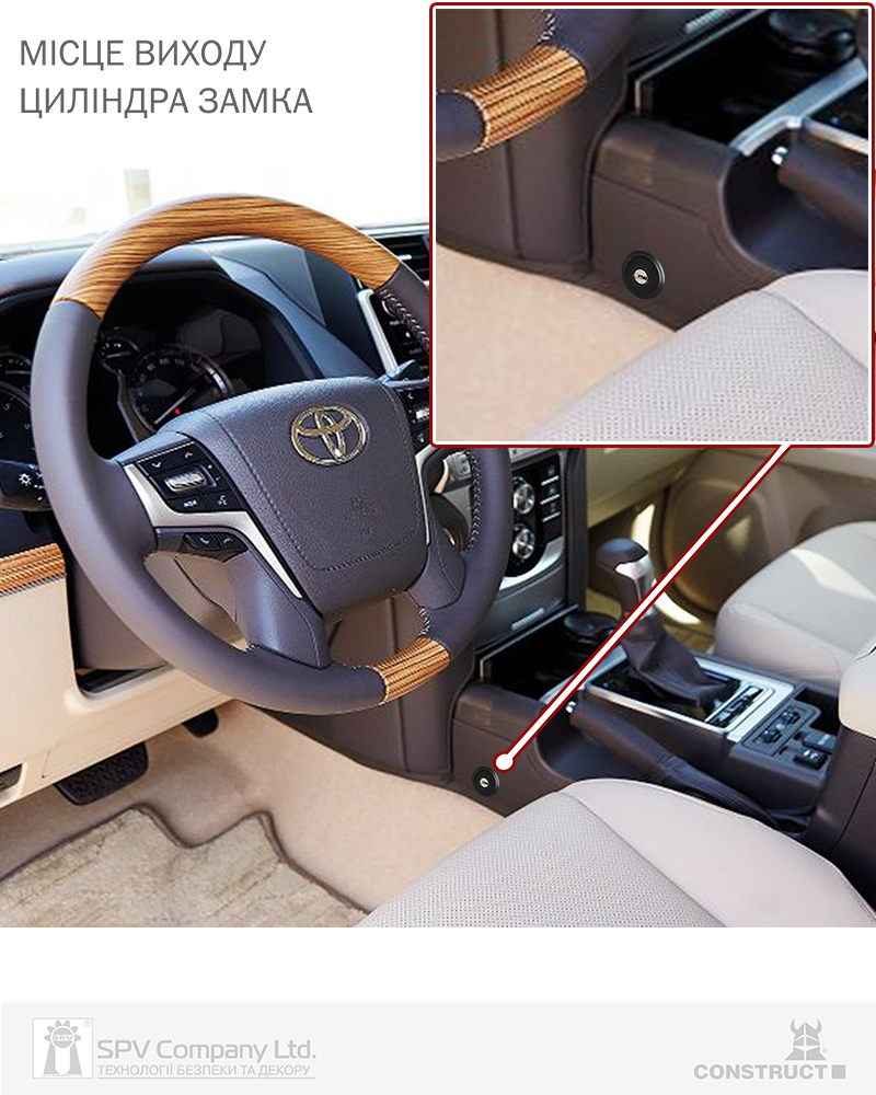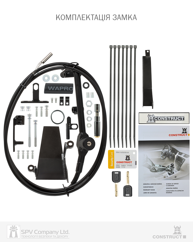 CONSTRUCT VARIO – комплексний механічний протиугінний замок, що одночасно блокує коробку перемикання швидкостей (КПШ) та відкриття капоту. Має унікальну конструкцію для конкретної моделі автомобіля та КПШ. Встановлюється за допомогою зривних болтів на штатні кріплення в кузові автомобіля. Принцип роботи CONSTRUCT VARIO полягає в блокуванні рухомих вузлів механізму перемикання швидкостей та блокуванні відкриття кришки капоту відносно кузову автомобіля. Механічні КПШ блокуються в положенні “R”- задній хід, а автоматичні – в положенні “P”- паркінг. Для замикання потрібно перевести важіль КПШ в потрібне положення, та переконатись, що капот закрито, вставити ключ в замок до упору та повернути ключ на 180° в крайнє положення. Відкрити його так само просто. В комплекті замка 2 ключа та пластикова картка для можливості виготовлення дубліката ключа. Не залежить від стану акумулятора та інших функцій автомобіля. Відкриття замка CONSTRUCT VARIO можливе виключно контактним способом за допомогою ключа, деактивація на відстані - неможлива.