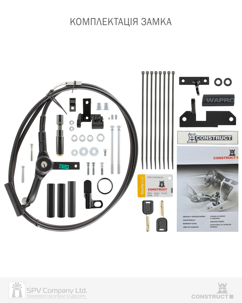 CONSTRUCT VARIO – комплексний механічний протиугінний замок, що одночасно блокує коробку перемикання швидкостей (КПШ) та відкриття капоту. Має унікальну конструкцію для конкретної моделі автомобіля та КПШ. Встановлюється за допомогою зривних болтів на штатні кріплення в кузові автомобіля. Принцип роботи CONSTRUCT VARIO полягає в блокуванні рухомих вузлів механізму перемикання швидкостей та блокуванні відкриття кришки капоту відносно кузову автомобіля. Механічні КПШ блокуються в положенні “R”- задній хід, а автоматичні – в положенні “P”- паркінг. Для замикання потрібно перевести важіль КПШ в потрібне положення, та переконатись, що капот закрито, вставити ключ в замок до упору та повернути ключ на 180° в крайнє положення. Відкрити його так само просто. В комплекті замка 2 ключа та пластикова картка для можливості виготовлення дубліката ключа. Не залежить від стану акумулятора та інших функцій автомобіля. Відкриття замка CONSTRUCT VARIO можливе виключно контактним способом за допомогою ключа, деактивація на відстані - неможлива.