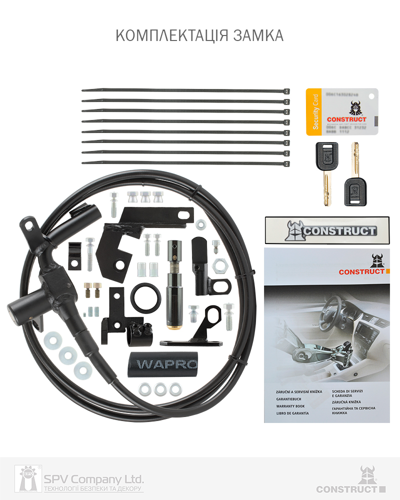 CONSTRUCT VARIO – комплексний механічний протиугінний замок, що одночасно блокує коробку перемикання швидкостей (КПШ) та відкриття капоту. Має унікальну конструкцію для конкретної моделі автомобіля та КПШ. Встановлюється за допомогою зривних болтів на штатні кріплення в кузові автомобіля. Принцип роботи CONSTRUCT VARIO полягає в блокуванні рухомих вузлів механізму перемикання швидкостей та блокуванні відкриття кришки капоту відносно кузову автомобіля. Механічні КПШ блокуються в положенні “R”- задній хід, а автоматичні – в положенні “P”- паркінг. Для замикання потрібно перевести важіль КПШ в потрібне положення, та переконатись, що капот закрито, вставити ключ в замок до упору та повернути ключ на 180° в крайнє положення. Відкрити його так само просто. В комплекті замка 2 ключа та пластикова картка для можливості виготовлення дубліката ключа. Не залежить від стану акумулятора та інших функцій автомобіля. Відкриття замка CONSTRUCT VARIO можливе виключно контактним способом за допомогою ключа, деактивація на відстані - неможлива.