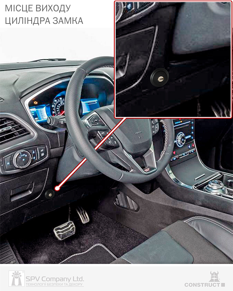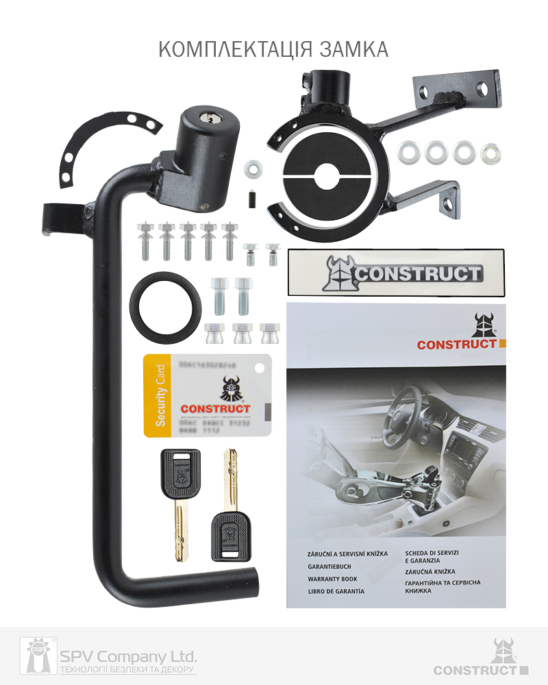 CONSTRUCT VOLANT – механічний протиугінний замок керма. Блокує поворот рульового валу, забезпечуючи тим самим найнадійніший захист від викрадення. Кожен замок має унікальну конструкцію під конкретну модель автомобіля, сконструйований з повним дотриманням вимог пасивної безпеки транспортного засобу. Дозволяє встановити замок з мінімальним втручанням в інтер'єр автомобіля. Встановлюється за допомогою зривних болтів на штатні кріплення в кузові автомобіля. Для замикання потрібно виставити кермо прямо, вставити ключ у замок до упору і повернути на 180°. Це єдиний спосіб закрити замок, можливість випадкового закриття - виключено. Відкрити замок так само просто. В комплекті замка 2 ключа та пластикова картка для можливості виготовлення дубліката ключа. Не залежить від стану акумулятора та інших функцій автомобіля. Відкриття замка CONSTRUCT VOLANT можливе виключно контактним способом за допомогою ключа, деактивація на відстані - неможлива.