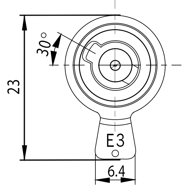 Даний язичок CAM у вільному положенні циліндра (коли ключі винути із циліндра) знаходиться в положенні 30 градусів відносно корпусу циліндра.
