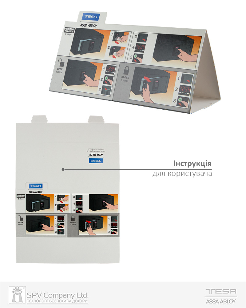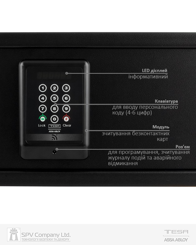 Електронний готельний сейф TESA SmartAir – оптимальне рішення для готелів, в яких встановлені системи електронних карткових замків TESA на безконтактних картах. Не потребує додаткового обладнання для адміністрування (використається те саме програмне забезпечення та програматор, що застосовуються для адміністрування системи електронних замків). Можливі режими доступу (визначаються в програмі адміністрування системи TESA Hotel): тільки персональний код, тільки картка гостя від номеру, подвійна ідентифікація - карта від номера + персональний код (забезпечує максимальну безпеку). В режимі подвійної ідентифікації можливе використання в готелях, в яких передбачено платне користування сейфом в номері.
