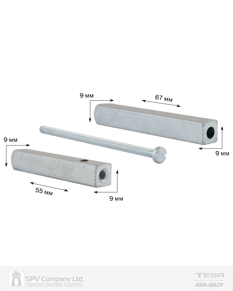 Розділений шток для використання з врізним антипанічним замком з роздільним квадратом та ручками 9 мм.