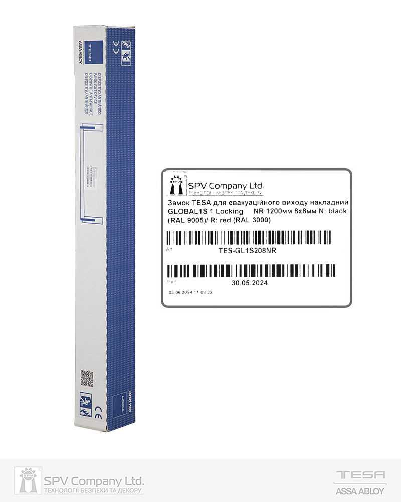 Пристрій антипаніки для дверей евакуаційних виходів серії GLOBAL, модель TESA GLOBAL1S накладного типу з одною точкою замикання.