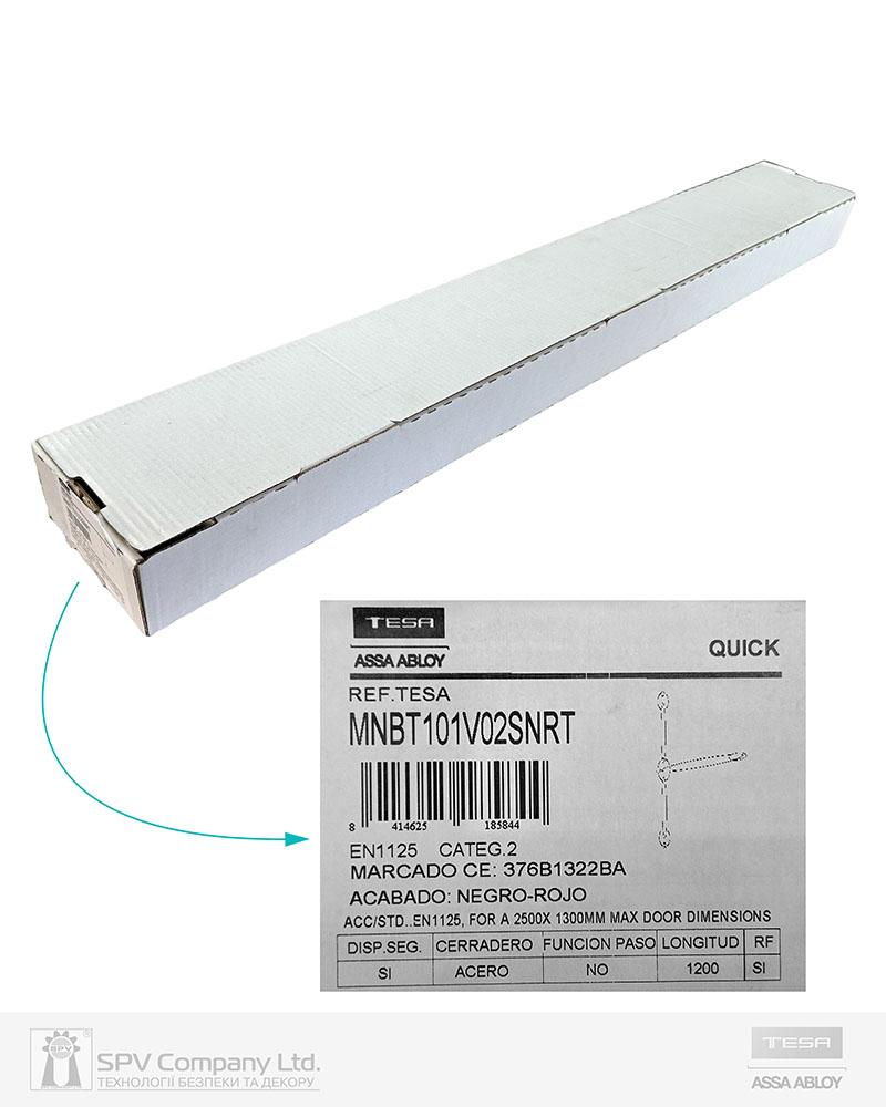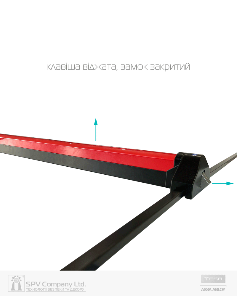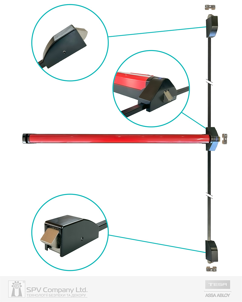 Пристрій антипаніки для дверей евакуаційних виходів серії QUICK, модель TESA QUICK3S накладного типу з трьома точками замикання (бічна защіпка основного механізму, верхня та нижня защіпки вертикального замикання).