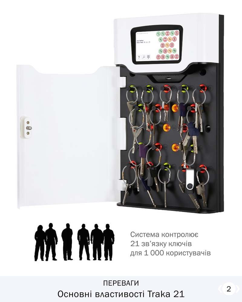 Допомагає відстежувати та обліковувати кожний ключ, який індивідуально блокується в своїй комірці та гарантує максимальний контроль використання механічних ключів працівниками. Система надає змогу надати права доступу до 1 000 користувачів.