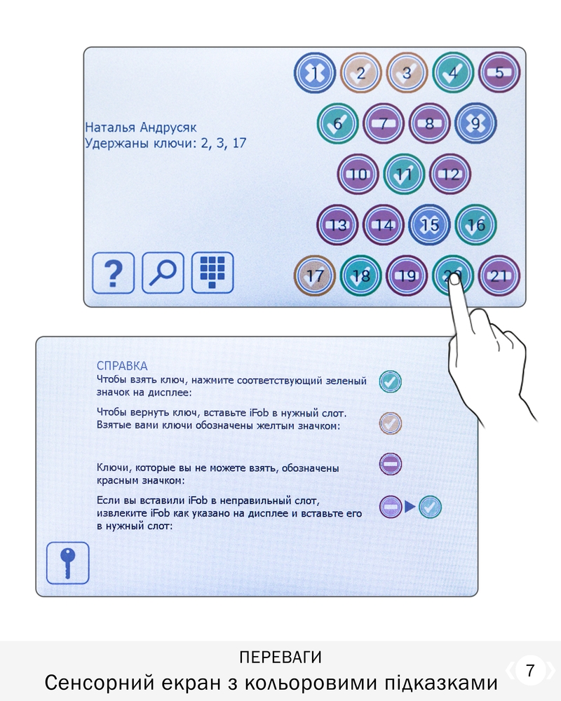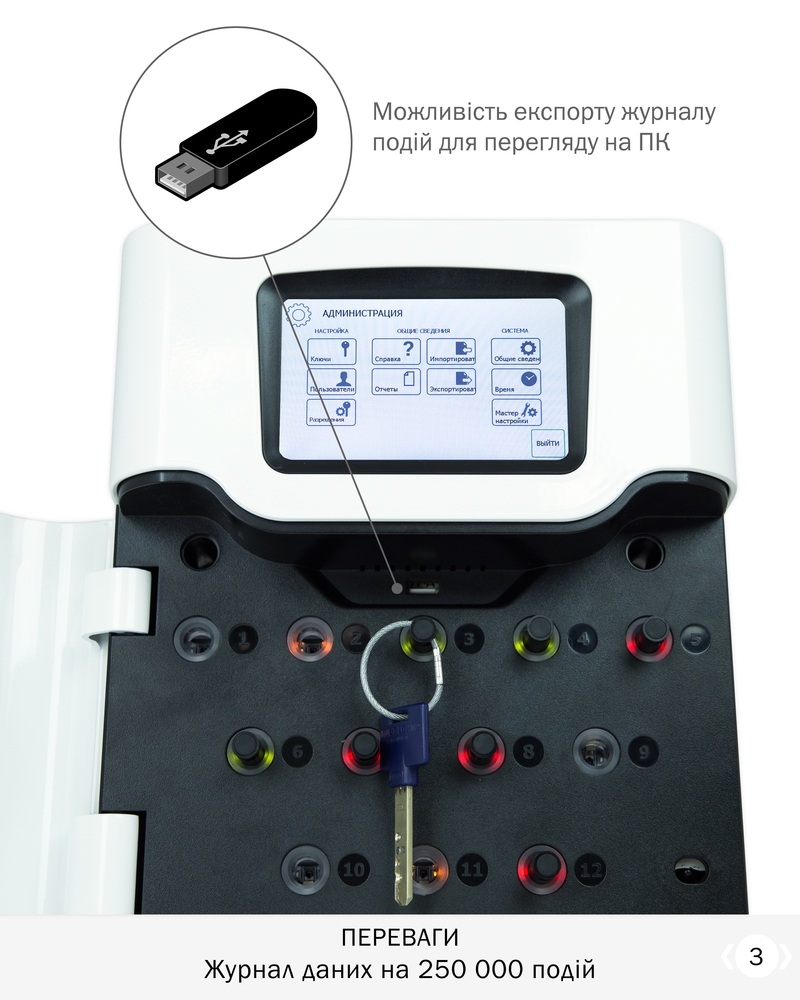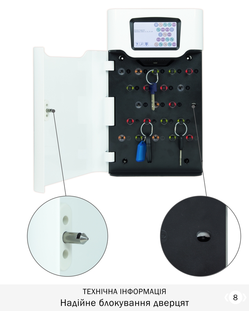 • Доступ відповідно до прав. Всі ключі індивідуально заблоковані в своїх комірках.