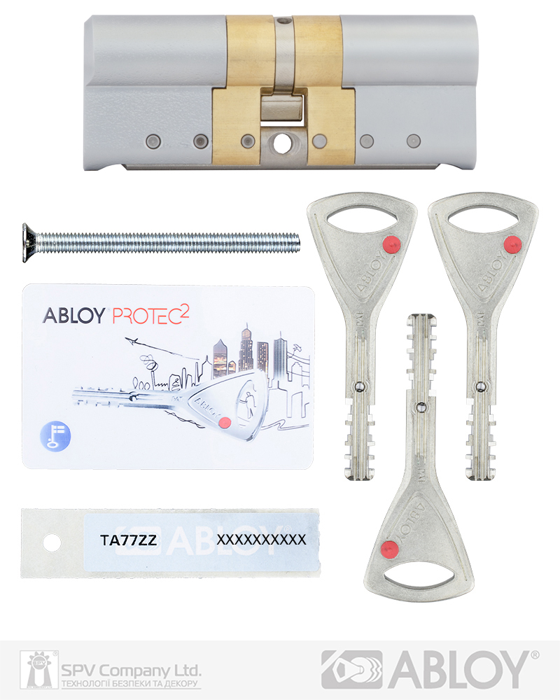 Комплектація: циліндр, 3 ключі, персональна картка+ персональна кодова наліпка, кольорові вставки в ключ, сталевий гвинт М5х85.