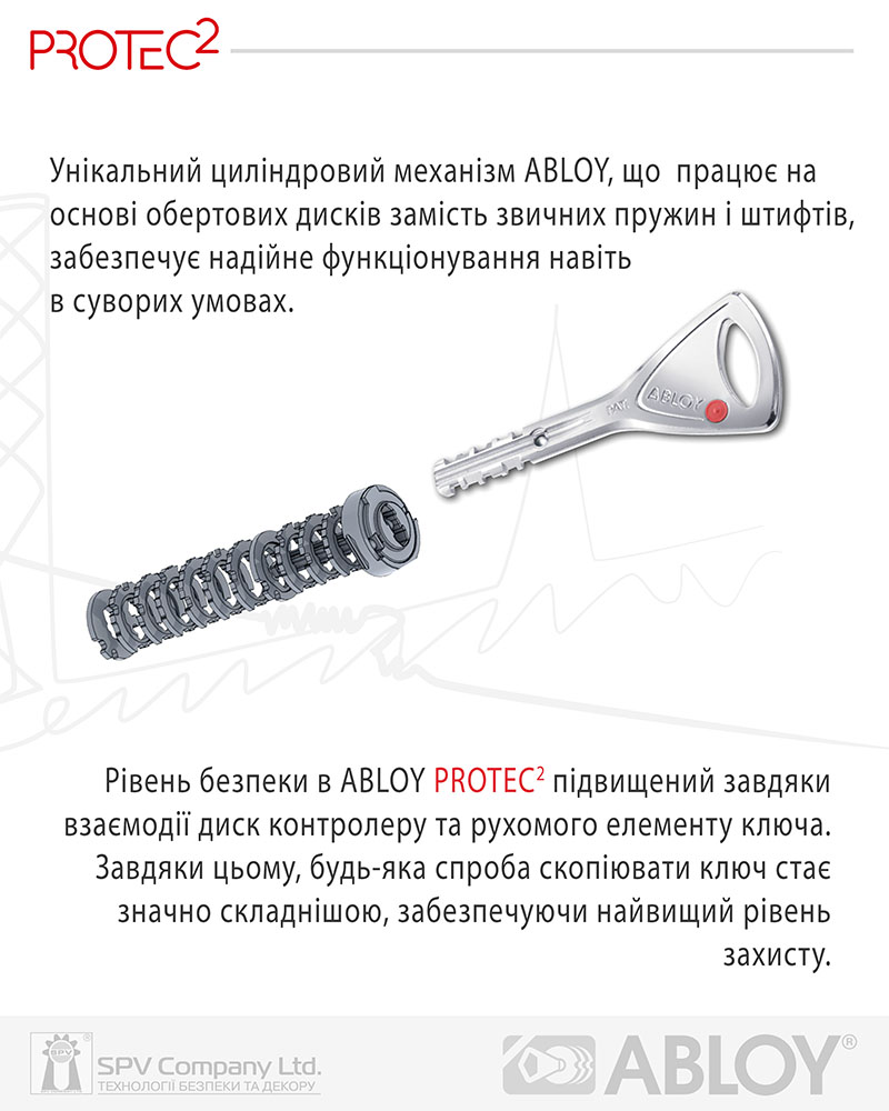 Циліндр ABLOY® PROTEC2 забезпечує передовий рівень безпеки та зносостійкості завдяки використанню обертових дисків замість традиційних пружин і штифтів. Запатентована технологія ABLOY® PROTEC2 є передовою та перевершує найвищі галузеві стандарти.