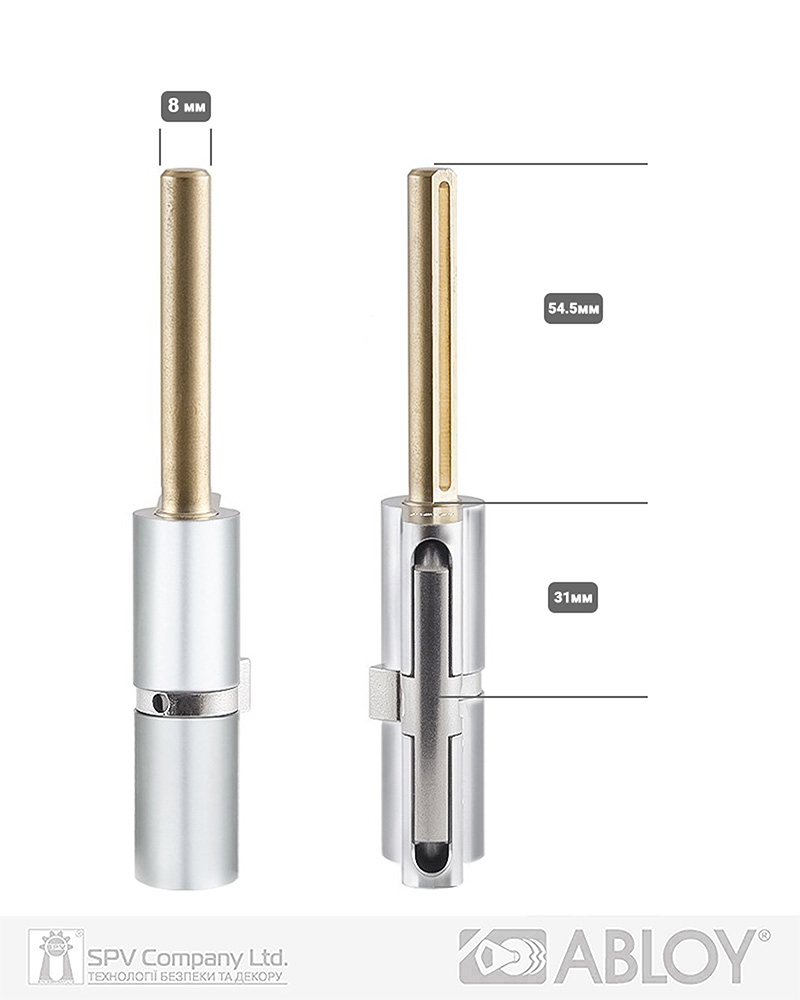 Це дозволяє не використовувати подовження для внутрішньої сторони циліндру (31 мм) на дверях різної товщини.