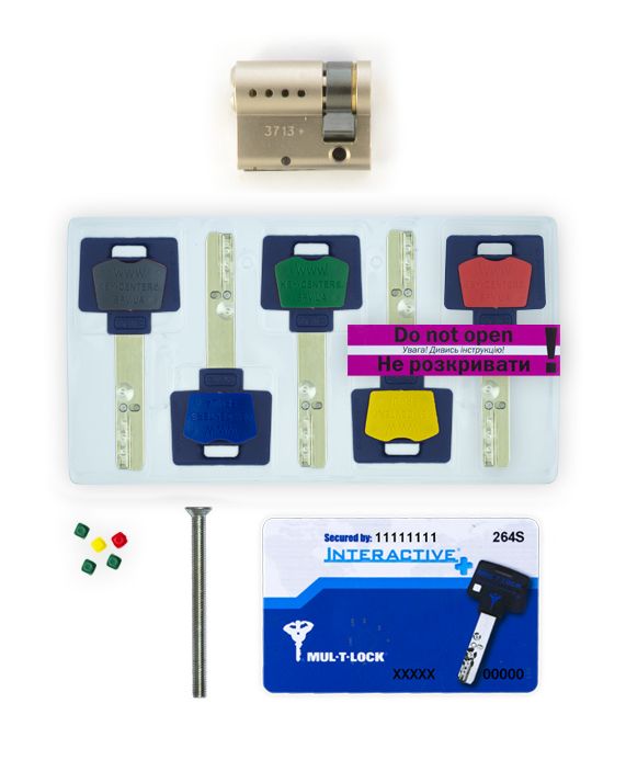 5 ключів з підготовкою під INSERT (кольорові вставки в ключ з логотипом Локсмайстер партнера), в комплектації 3+1+1 (Три ключі з зеленою міткою для початкового щоденного використання, четвертий ключ з жовтою міткою для перекодування циліндра, п'ятий ключ з червоною міткою для другого перекодування циліндра)