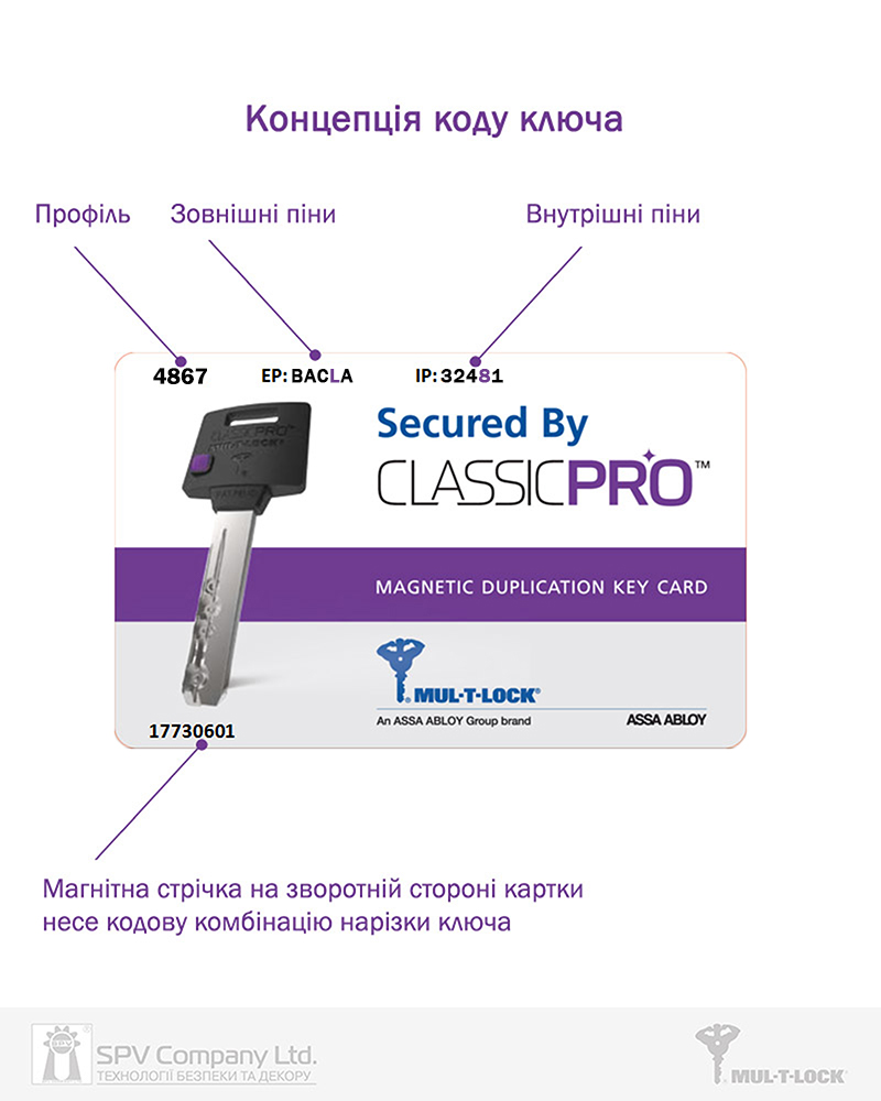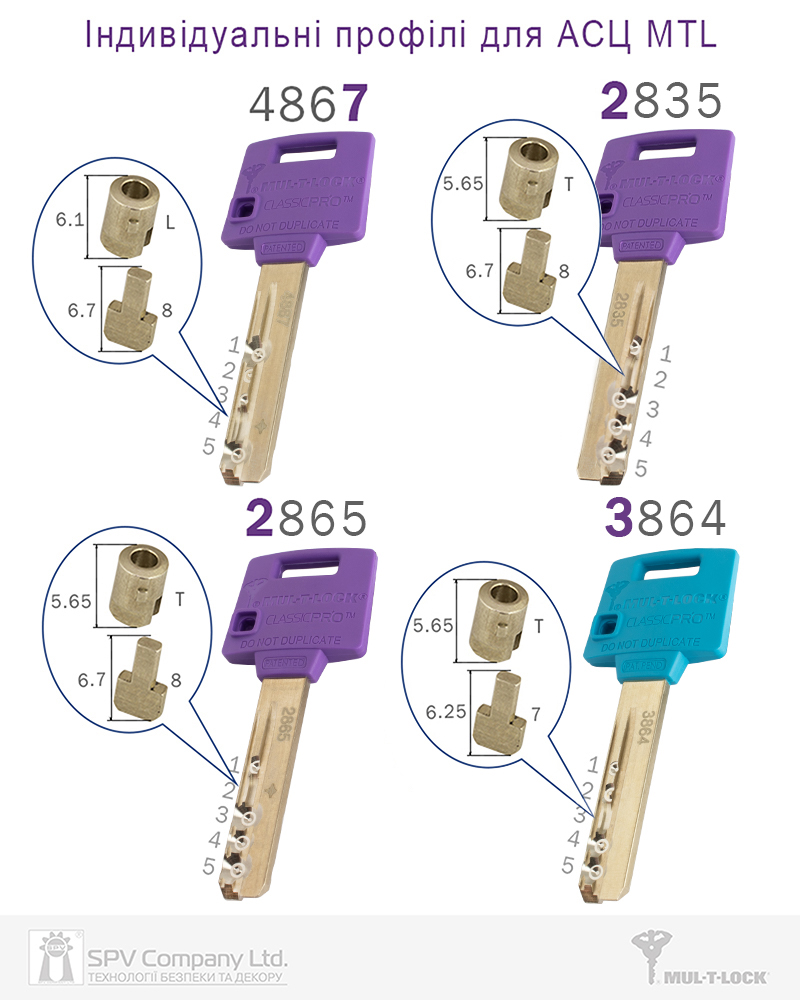 Оригінальний номер профілю завжди маркується виробником на лезі ключа або на кодовій картці ABLOY TA77ZZ PROTEC 2 СПВ (старий) TA55CC PROTEC 2 індивідуальний Topzamok TA77BB PROTEC 2 СПВ (новий) TA77NN PROTEC 2 індивідуальний РУСТ MUL-T-LOCK 839B_XXXXX MTL800 загальний основний, без "змійки", до циліндрів MTL800 948B 264S+ MTL600 загальний основний з 2001 року до циліндрів MTL600 264S+ та Interactive 264S 223S+ MTL600 основний профіль з набору Майстер профілів та профіль CLIQ 206S+ MTL600 загальний основний до циліндрів Interactive 206S до 2001 року 264G+ MTL600 циліндри ENTR 223G+ MTL600 до замків ArmadLock та WatchLock 4867 MTL400 СПВ (старий) 2835 MTL400 основний профіль з набору Майстер профілів 2865 MTL400 СПВ (новий) 3864 MTL400 індивідуальний СТРАТЕГ КОМПАНІ 3865 MTL400 індивідуальний РУСТ 3867 MTL400 індивідуальний КОМПЛЕКСНЕ РІШЕННЯ 4864 MTL400 індивідуальний ПІД ЗАМКОМ 4865 MTL400 індивідуальний СВІТ ЗАМКІВ 5865 MTL400 індивідуальний Topzamok 5867 MTL400 індивідуальний БЕЗОПАСНОСТЬ MUL-T-LOCK (старі) 264S Interactive загальний основний з 2001 року до циліндрів Interactive 264S 206S Interactive загальний основний до 2001 року до циліндрів Interactive 206S 215S Interactive резервний профіль з набору Майстер профілів 235S Interactive резервний профіль з набору Майстер профілів 299S_MASTER Interactive профіль з набору Майстер профілів 113S Interactive резервний профіль з набору Майстер профілів 248S Interactive Poland - China 252S Interactive Poland - China 262S Interactive Poland - China 250S Interactive СODKEY 266S_SUPERLOCK Interactive SUPERLOCK 215G_OIKOS Interactive OIKOS 064 Classic загальний основний з 2001 року 006 Classic загальний основний до 2001 року 005 Classic індивідуальний БЕЗОПАСНОСТЬ 035 Classic основний профіль з набору Майстер профілів 013 Classic резервний профіль з набору Майстер профілів 015 Classic резервний профіль з набору Майстер профілів 025 Classic резервний профіль з набору Майстер профілів 099_MASTER Classic резервний профіль з набору Майстер профілів 050 Classic Poland - China 052 Classic Poland - China 062 Classic Poland - China 036 Classic СODKEY 008 Classic SUPERLOCK 376P_INTERNAL Integrator загальний основний 376E_EXTERNAL Integrator профіль з набору Майстер профілів 376M_MASTER Integrator профіль з набору Майстер профілів 0767 7x7 загальний основний
