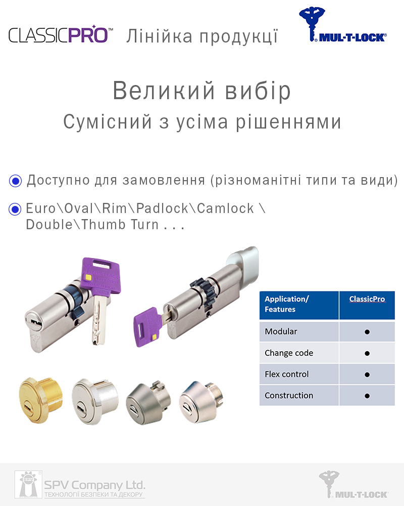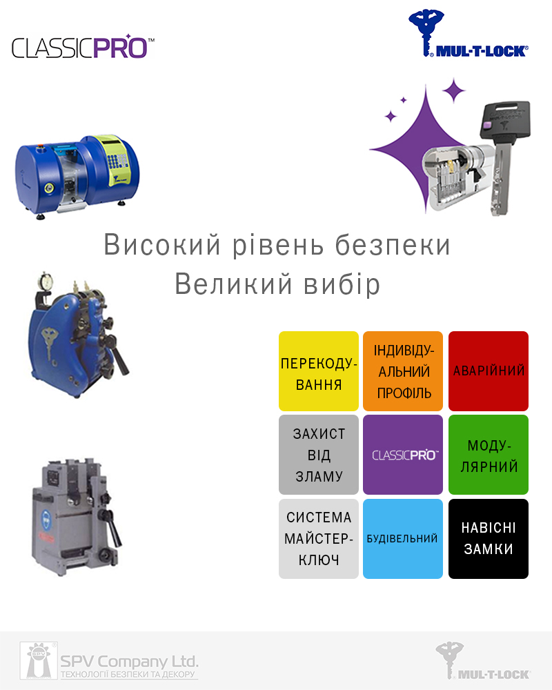 PROTEC2 – патентована дискова ключова платформа ABLOY класу Extra Protected High Security NOVEL – патентована дискова ключова платформа ABLOY класу Extra Security SENTRY - патентована дискова ключова платформа ABLOY класу High Security для промислового застосування MTL800/MT5+ – патентована ключова платформа Mul-T-Lock класу Extra Protected High Security MTL600/INTERACTIVE+ – патентована ключова платформа Mul-T-Lock класу Extra Protected High Security MTL400/ClassicPro - патентована ключова платформа Mul-T-Lock класу High Security INTEGRATOR - патентована ключова платформа Mul-T-Lock класу High Security 7x7 - ключова платформа Mul-T-Lock класу Standart Security OMEGA - унікальний патентований механізм Omega з розміщенням пінів у трьох площинах UNIV_C/CP/I/I+» - універсальні сервісні частини для платформ: Classic, ClassicPro, Interactive, Interactive+.
