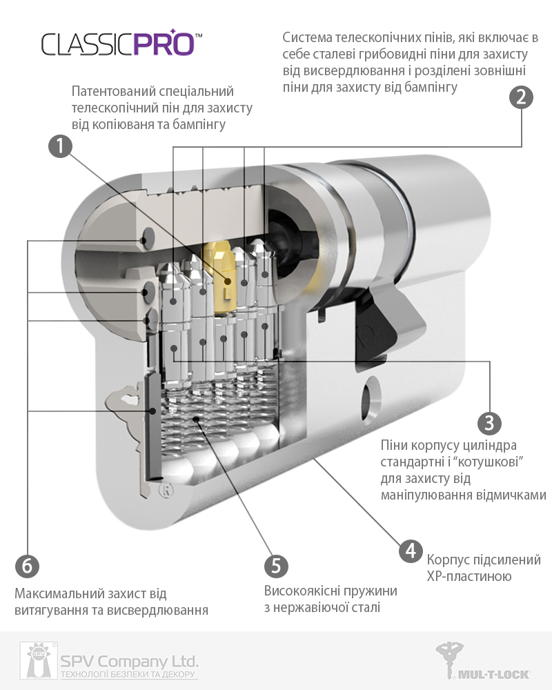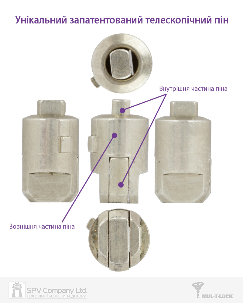 • Класична технологія «Подвійний телескопічний пін», п’ять пар телескопічних пінів, в тому числі запатентований телескопічний пін спеціальної форми, що потребує під себе особливу нарізку на ключі.