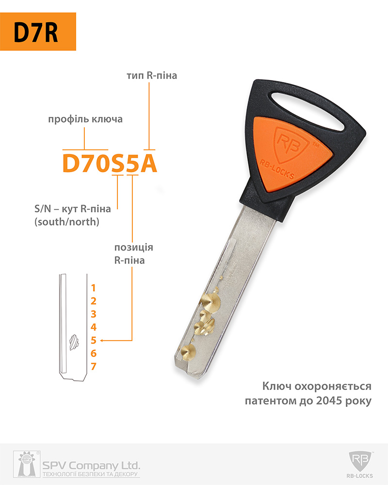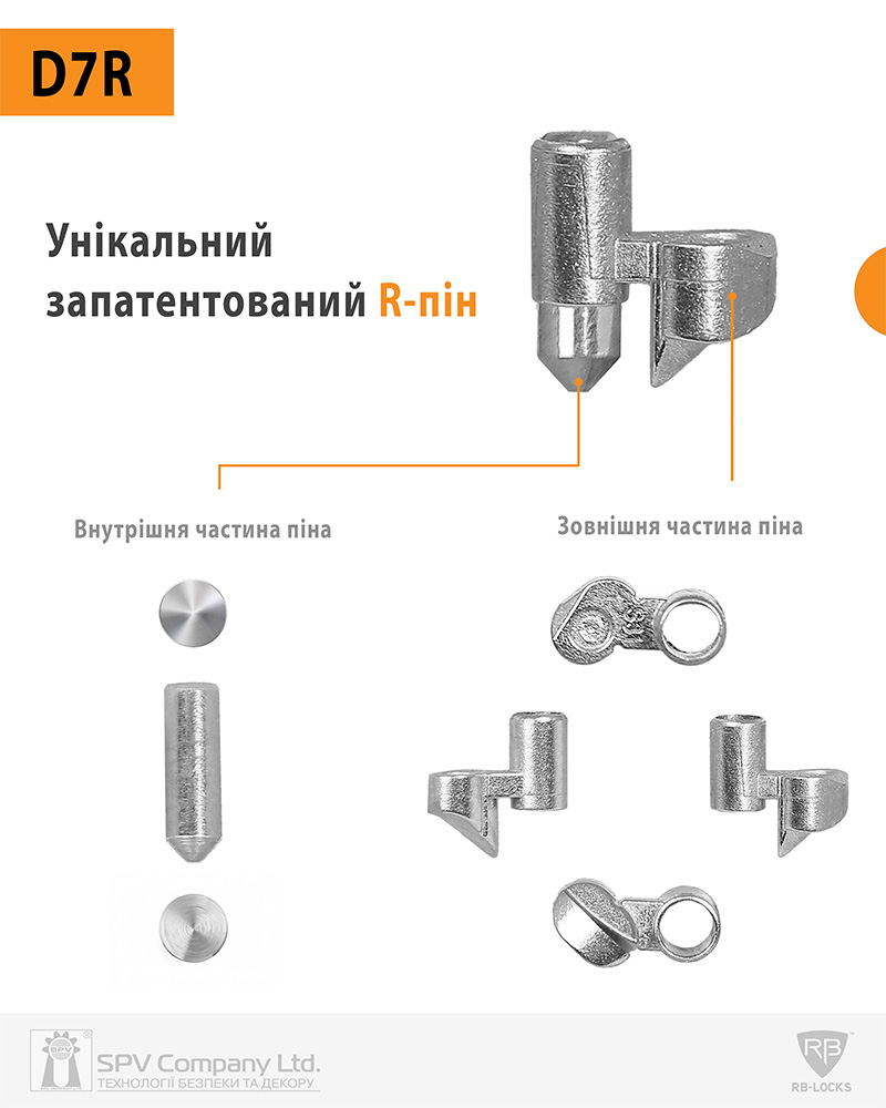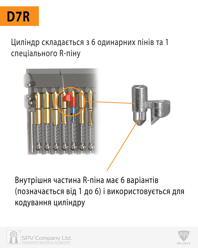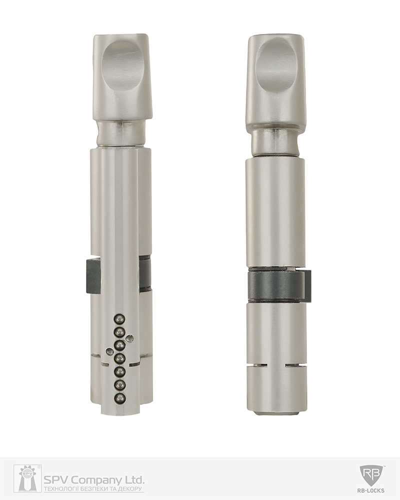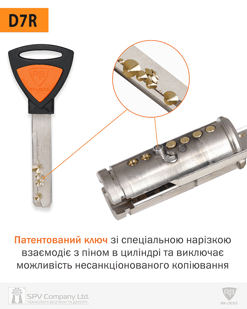 • Тип механізму: піновий циліндр класу High Security зі спеціальним патентованим піном, розробленим для системи RB LOCKS D7R.
