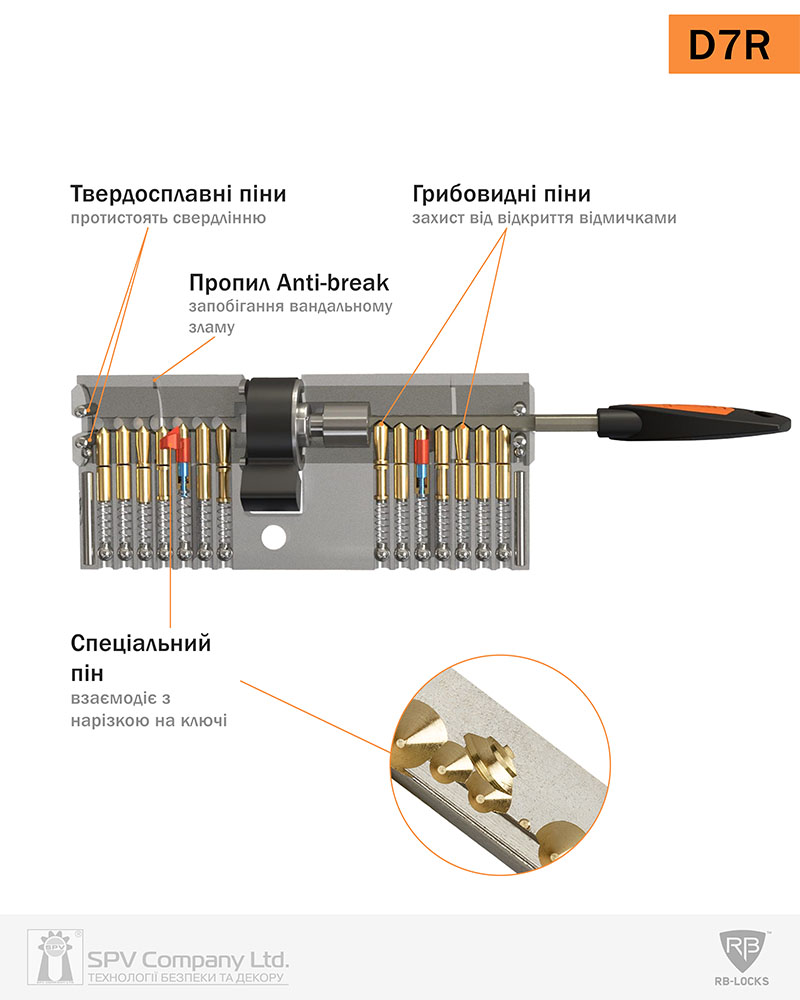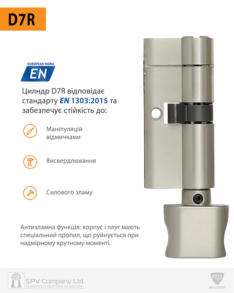 • Антизламна функція: корпус і плуг мають спеціальний пропил, що руйнується при надмірному крутному моменті. Після переламу доступ до механізму неможливий, але авторизований ключ продовжує працювати з циліндром RB LOCKS D7R.