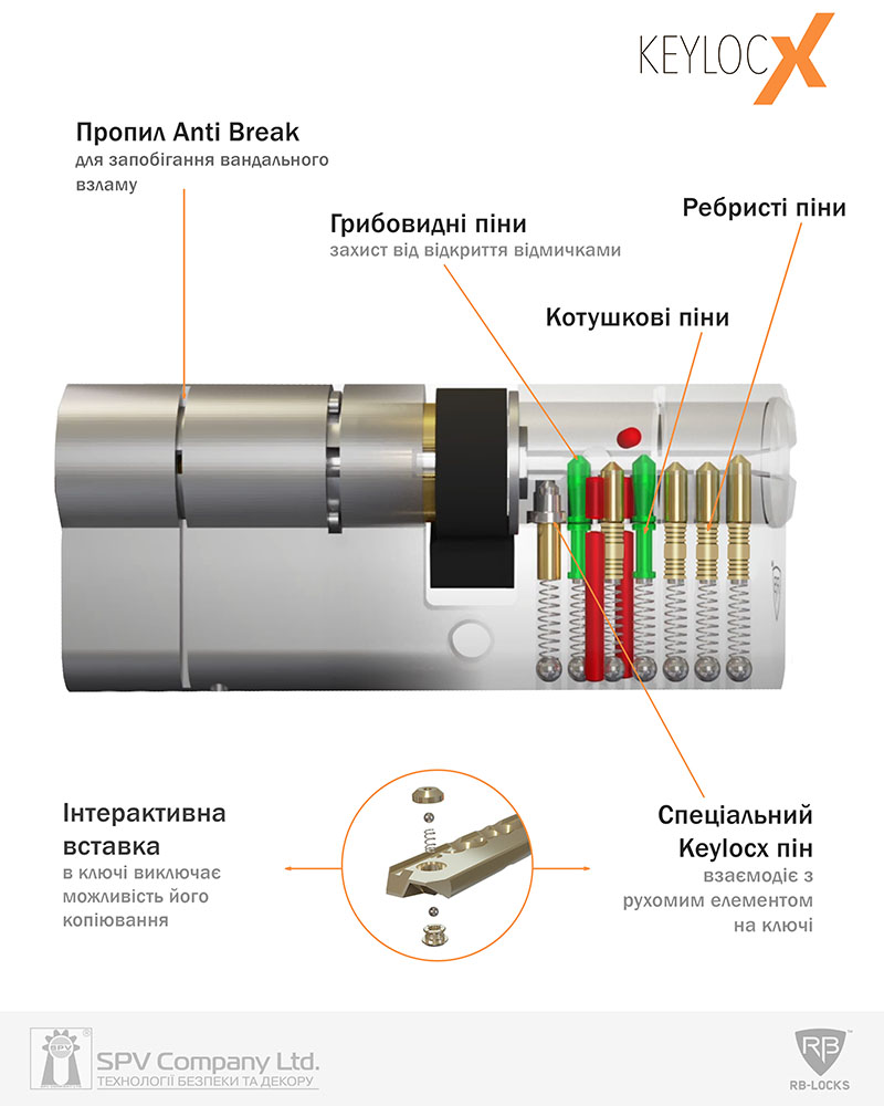 -    Тип механізму: піновий циліндр класу High Security зі спеціальним патентованим піном, розробленим для системи RB LOCKS KEYLOCX.