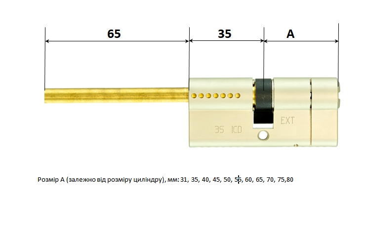 Розмір корпусу циліндру всередину (внутрішня симетрія) завжди 35мм + подовжений хвостовик тумблера, довжиною 65мм.