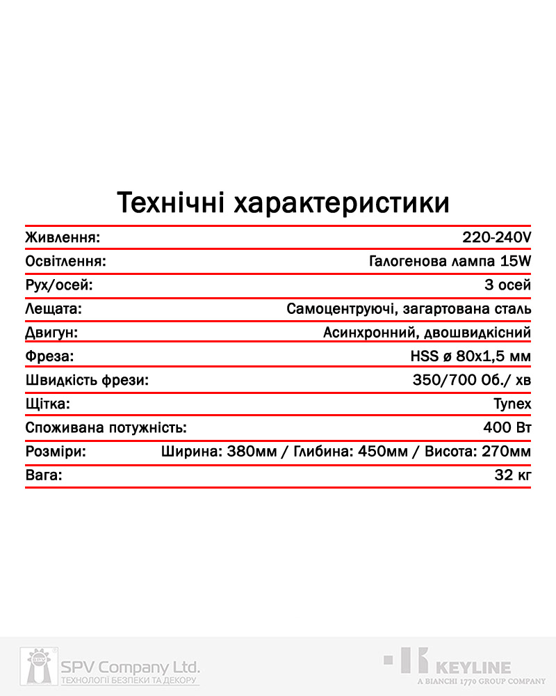 ► Двошвидкісним асинхронним двигуном потужністю 400w для вибору швидкості нарізки, залежно від матеріалу оброблюваної заготовки: завдяки цьому досягається висока точність нарізки ключів і довгий життєвий цикл ріжучої фрези;