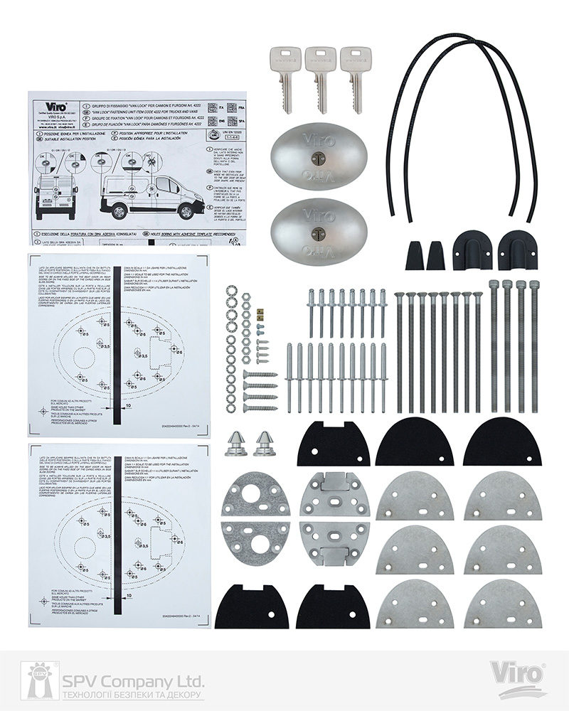 2 анкерні пластини: перша в формі півмісяця з нержавіючої сталі фіксується на першій з дверей закриття (для задніх дверей) та на фіксованій частині (для бокових ковзних дверей); друга трапецієвидна пластина кріпиться на другій з дверей відкриття (для задніх дверей) та на розсувній частині (для ковзних дверей збоку вантажного відділення).