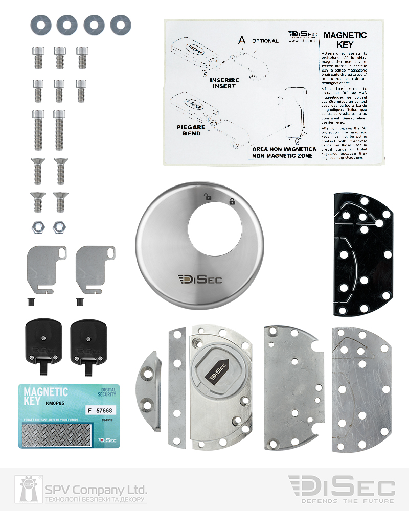 - До комплекту входять: замок, пластини для монтажу, комплект кріплення, кодова картка, два магнітних ключа, металеві вставки для захисту від магнітного поля, яке створюється ключами.
