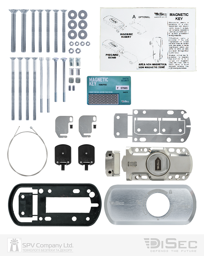 До комплекту входять: замок, пластини для монтажу, комплект кріплення, кодова картка, два магнітних ключа, металеві вставки для захисту від магнітного поля, яке створюється ключами.