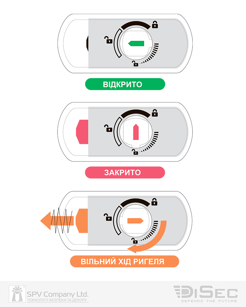 Для відкриття дверей потрібно: із зовні – прокрутити ключем за годинниковою стрілкою, щоб ригель відімкнув двері. Після відмикання, під дією пружини ригель стане в початкове положення («Вільний хід ригеля»). Із середини автомобіля – потягнути за тросик. Відкриття з середини за допомогою тросика можливе, коли замок перебуває в режимі «Вільний хід ригеля».