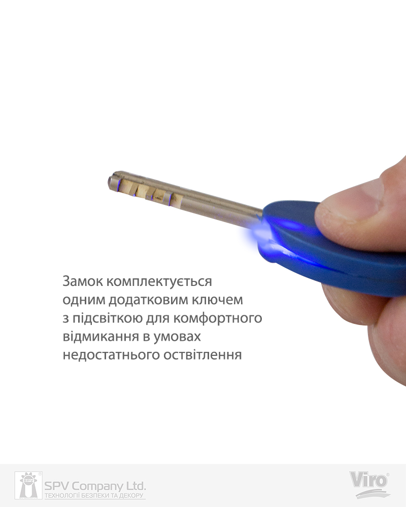 Циліндр з латуні, з 7 дисками, захищений пластиною проти виламування і закритий корпусом з загартованої сталі з нековзним покриттям ABS;