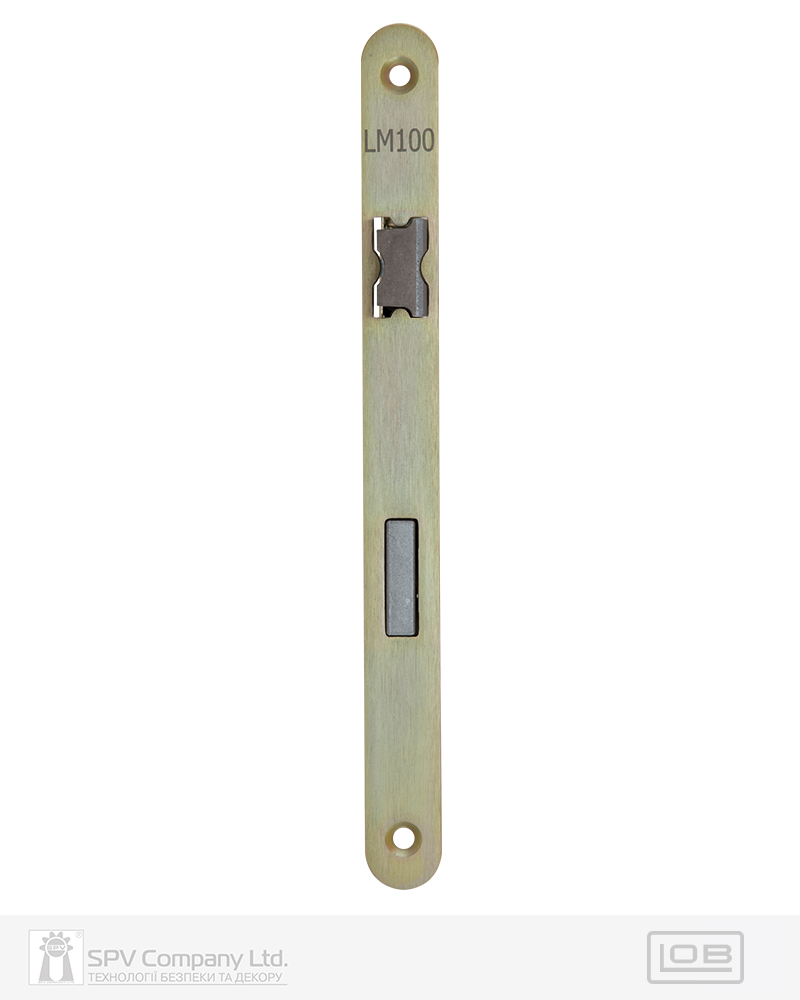 Замок для сантехнічних приміщень LM 100 WC. Замикання – поворотною кнопкою 6 мм. Засовується з фурнітурою DIN стандарту. Mіжцентрова відстань 72 мм. BackSet 50 мм. Вихід ригеля – 10 мм. Нереверсивна заскочка. Сторонність – прайий. Торцева планка: обробка – порошкова фарба під латунь. Зворотна планка замовляється окремо.