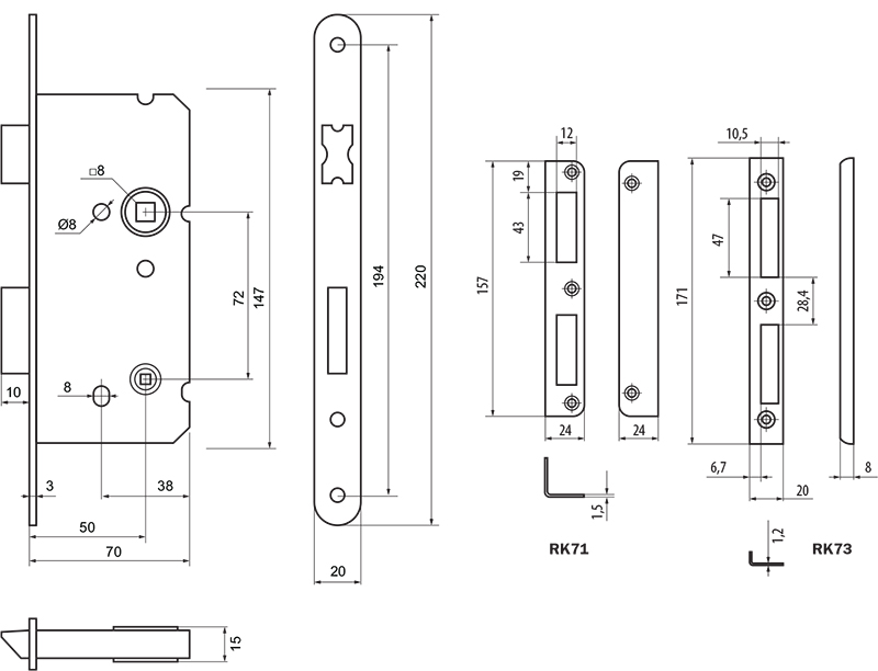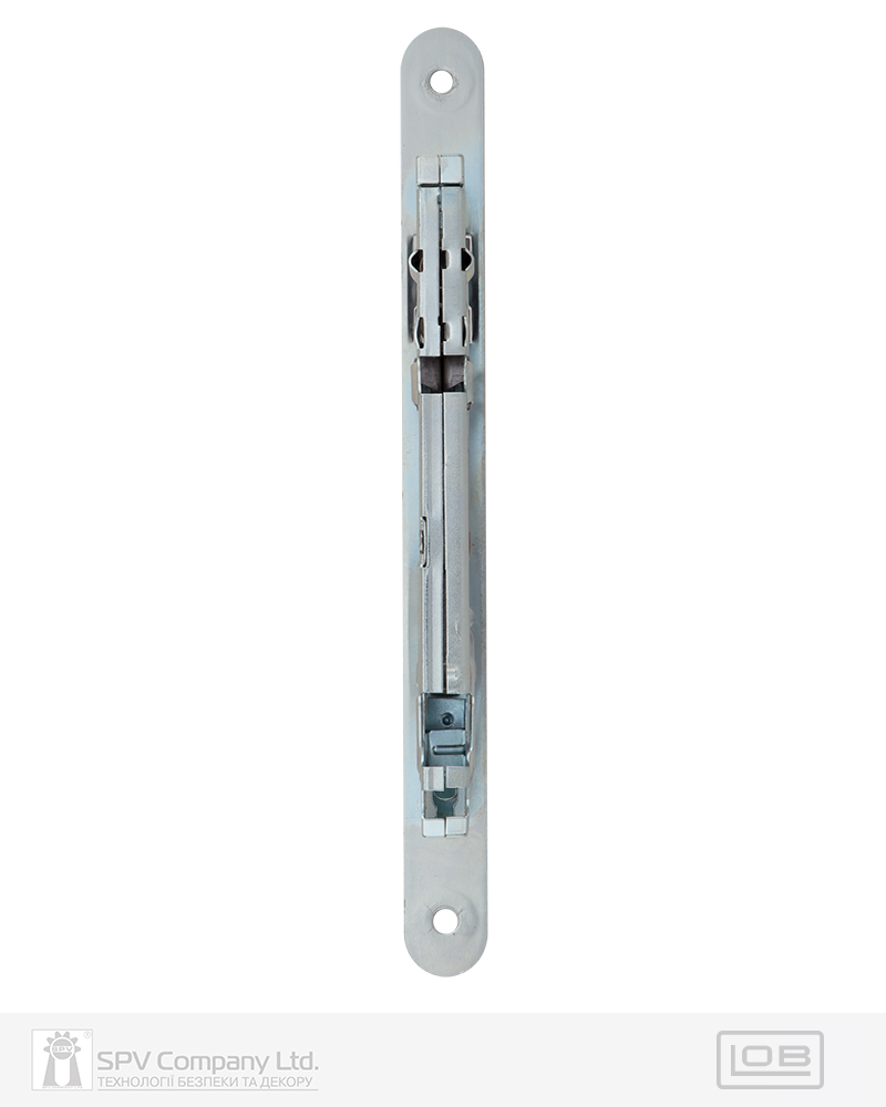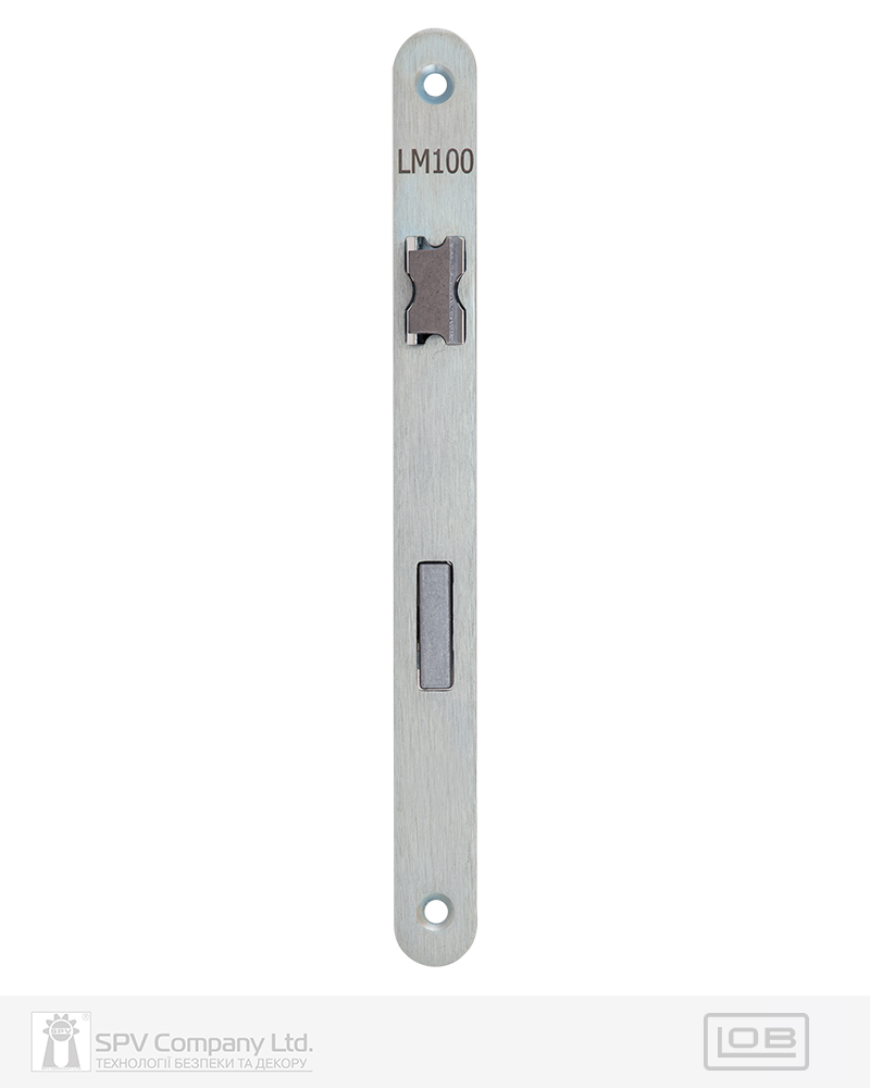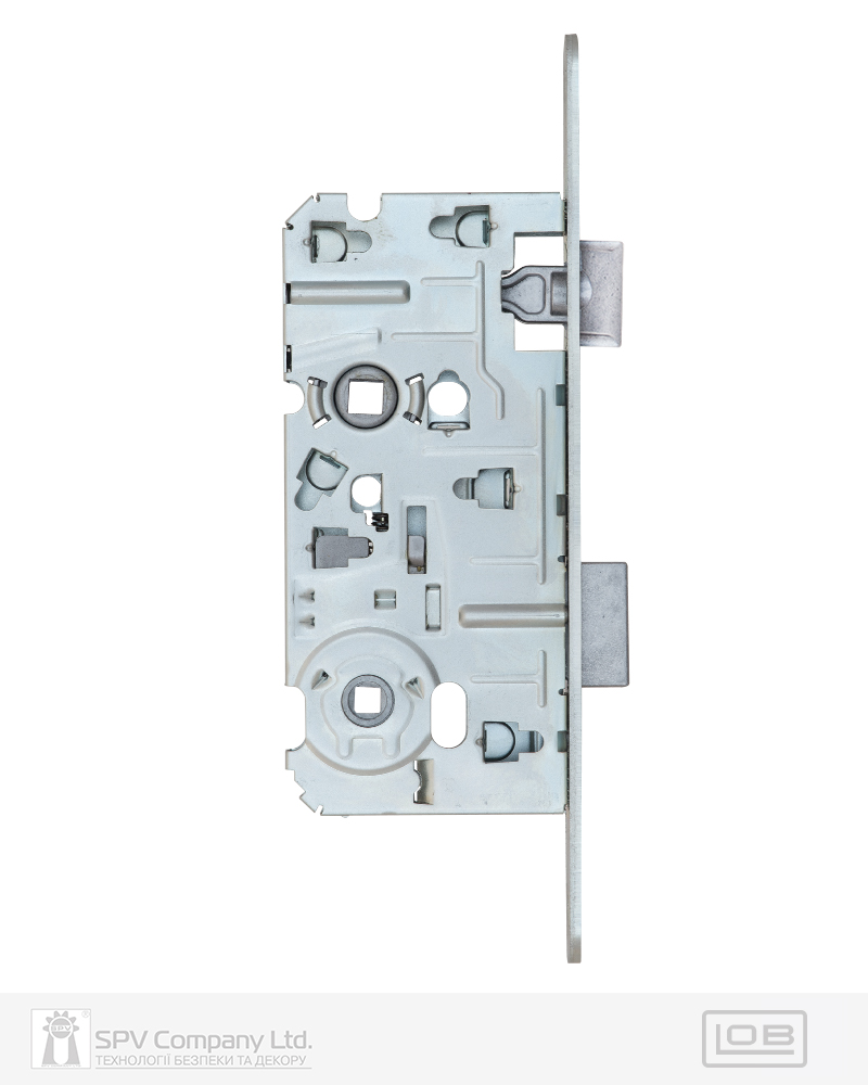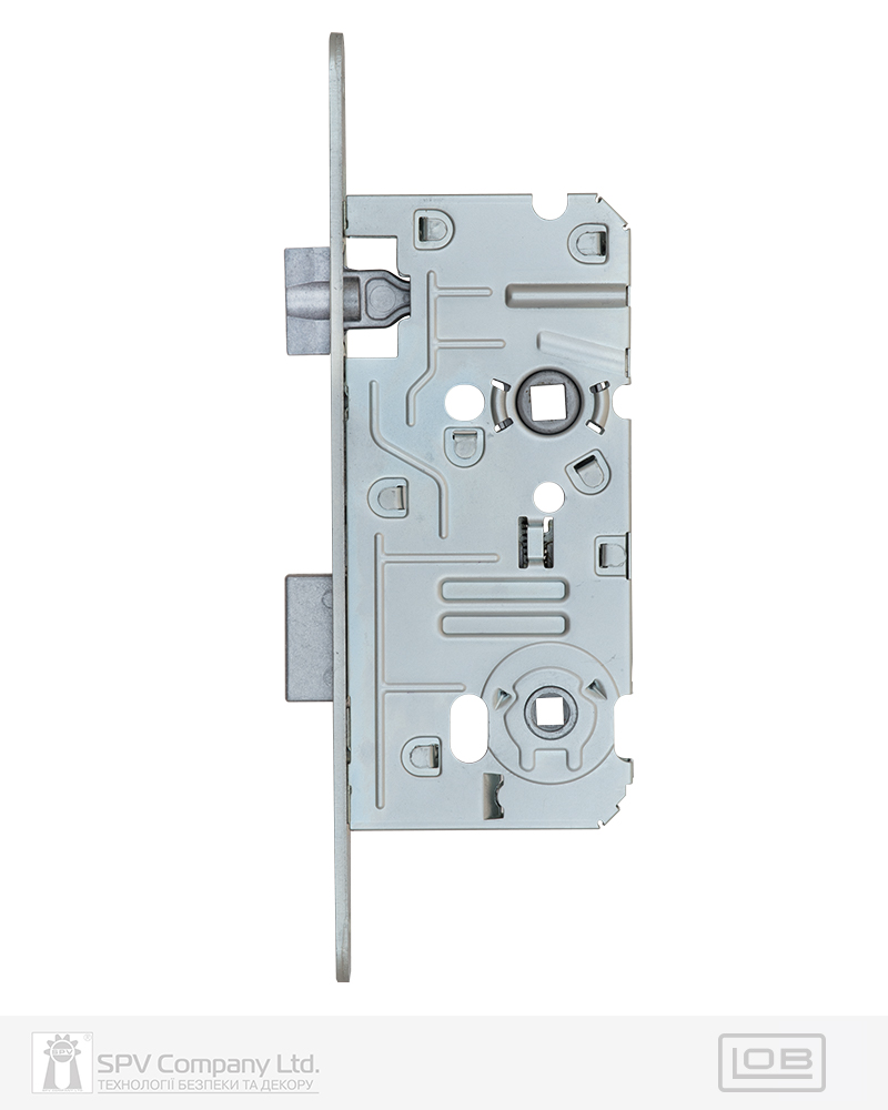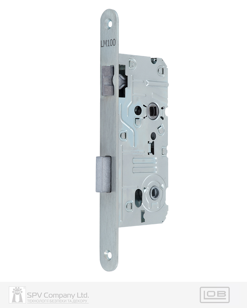 Замок для сантехнічних приміщень LM 100 WC. Замикання – поворотною кнопкою 6 мм. Засовується з фурнітурою DIN стандарту. Mіжцентрова відстань 72 мм. BackSet 50 мм. Вихід ригеля – 10 мм. Нереверсивна заскочка. Сторонність – правий. Торцева планка: обробка – оцинкована сталь. Зворотна планка замовляється окремо.