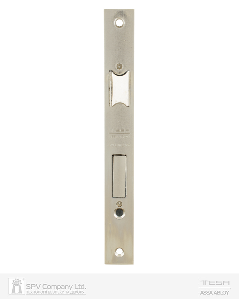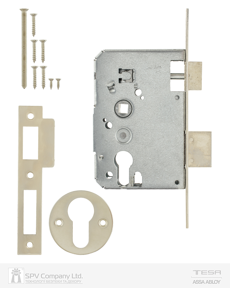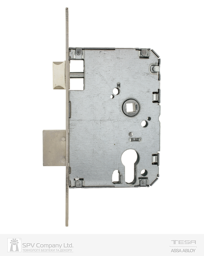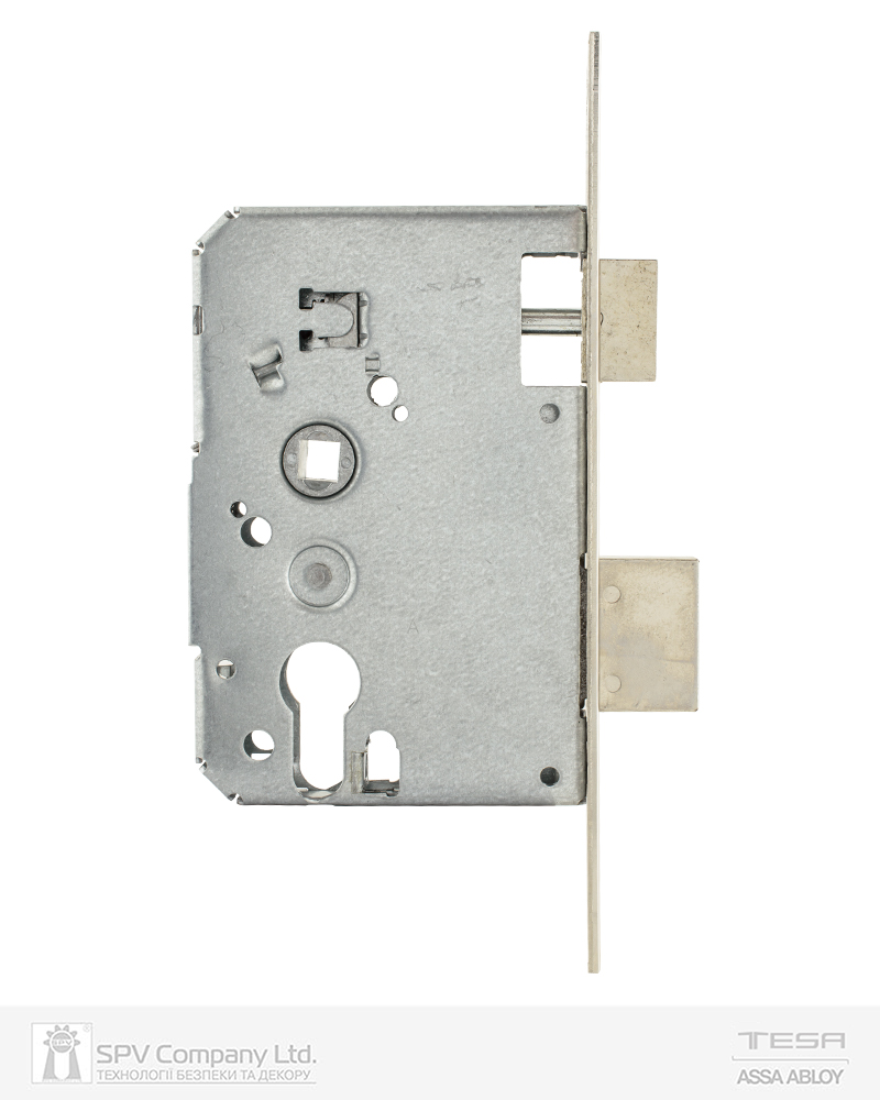 Основний замок Tesa 2010P для дерев’яних або металевих дверей під DIN циліндр. Має специфічну міжцентрову відстань – 47 мм, тому може використовуватися тільки з фурнітурою на роздільному щитку.