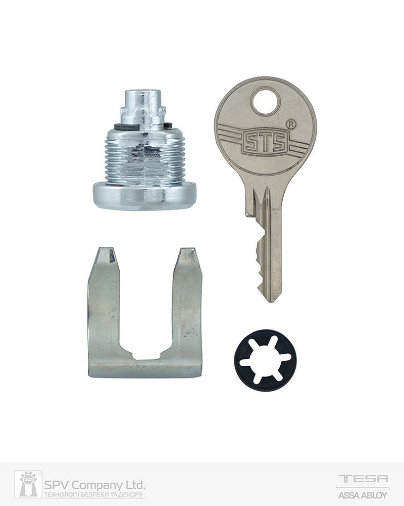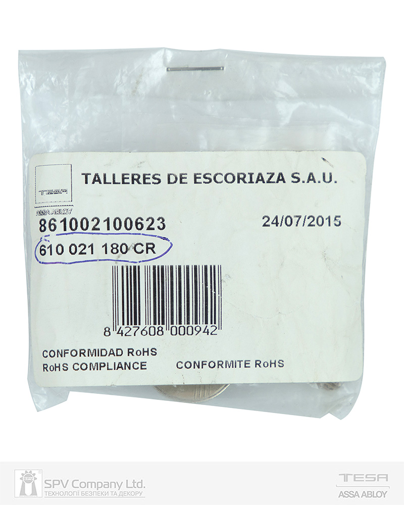 Врізний замок TESA 610.021 CAM-типу з накидним ригелем. Підходить для металевих шаф (поштові скриньки, шафки для одягу, аптечки, електрощитки і т.д.). Для дверцят товщиною від 0,8 до 2,5 мм. Кріплення до дверцят – затискачем. Кут оберту ригеля - 180°. Циліндр: TESA "пластинчатого" типу. Кількість пластин: 5. Кількість кодових комбінацій: 3 125.. Матеріал: замак, накидний ригель - сталь. Обробка: хром. Комплектація: 2 ключа.
