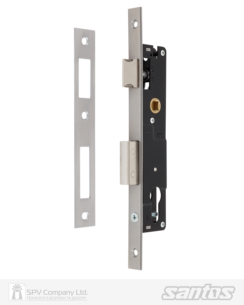 Основний замок SANTOS Profile Lock 726 для профільних дверей під циліндр DIN. Сумісний з фурнітурою ROSTEX для профільних дверей. Міжцентрова відстань 85 мм. BackSet 25 мм. Глибина корпуса 40 мм. 1 прямий ригель. Вихід ригеля – 16 мм. Реверсивна заскочка. Сторонність – універсальний (правий/лівий). Торцева планка: обробка – нержавіюча сталь, ширина - 22 мм. Комплектація: замок, зворотна планка, пластиковий щиток чорний PZ (2шт.)