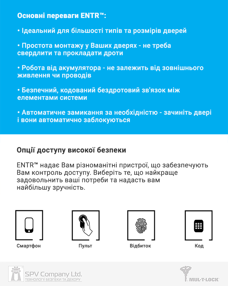 Опції відмикання: з мобільного додатку ENTR (сумісний з мобільними пристроями з ОС Android та iOS), за допомогою пульта дистанційного керування MUL-T-LOCK ENTR, за персональним кодом з електронного зчитувача MUL-T-LOCK ENTR Touchpad, за відбитком пальцю або кодом з використанням електронного зчитувача MUL-T-LOCK ENTR Fingerprint або в екстрених випадках механічним ключем.